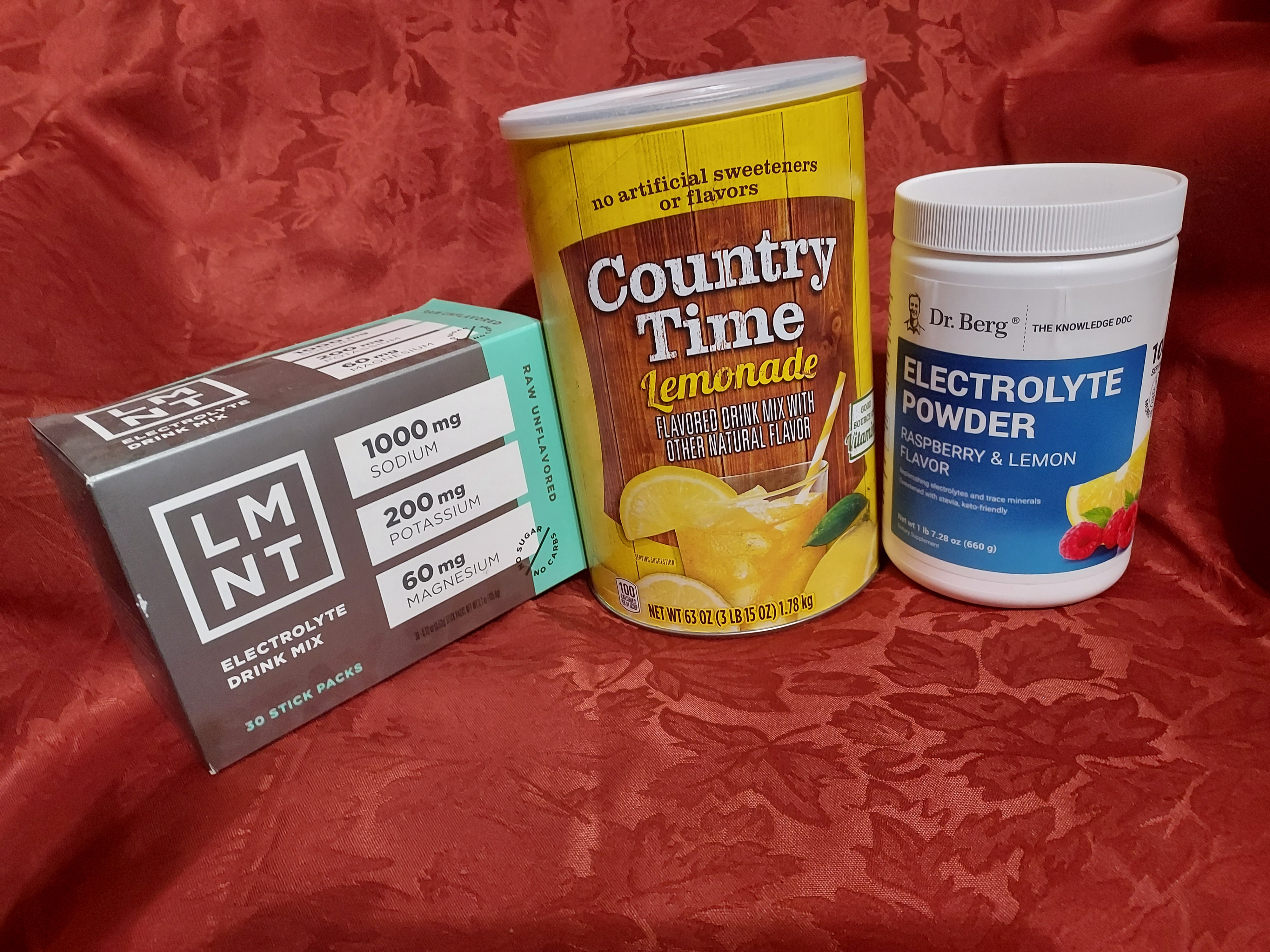 For a gallon of lemonade I would recommend one packet of unflavored LMNT, two full scoops of Dr. Berg’s Raspberry Lemonade powder, and six scoops of Country Time lemonade powder. If you think that might be a bit overpowering for your family, just do five scoops of Country Time.