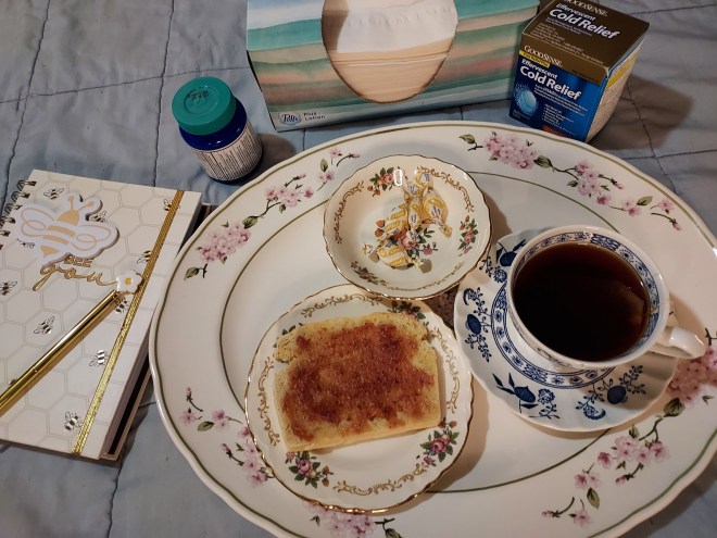 Now for a side note. What if you are single, whether or not by choice? How would you want to be treated if you did have a spouse? Treat yourself that way! Take the cold/flu medication if you medically can. Put yourself down for a nap when you can not stay awake. Enjoy that mug of tea and something fun or sappy on the television while you snuggle into the couch or sandwiched between your little ones on your bed. If you fall asleep during it? Oh, well. Just make sure the tea is on your side table. Make yourself your favorite comfort food. The kids may even like it. If not, you’ve got leftovers. Yay. Take care of yourself. You are the only one of yourself that you have.
