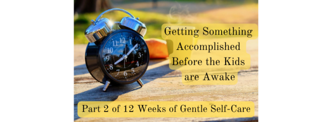 Therefore, this week’s self-care habit is waking up before the kids, and for those of us who already do that, getting something useful accomplished. The something useful may change from day to day as I zero in on what works best for me in this season, but things I would like to try are: